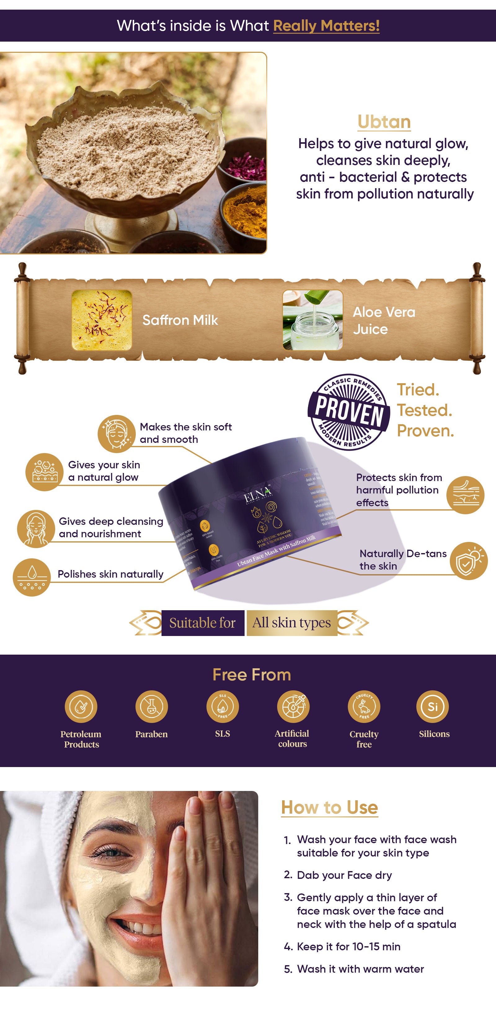 Ubtan gently exfoliates dead skin cells and helps remove impurities from pores, cleaning and refreshing the skin.